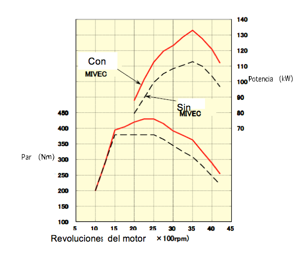 * MIVEC y las posibilidades que ofrece en términos de control del flujode aire: a plena carga, el excelente nivel de potencia y par se obtienegracias a 1) el elevado alzado de las válvulas de admisión y 2) laaplicación de un amplio ángulo de operación de las válvulas en elmodo de alta velocidad.